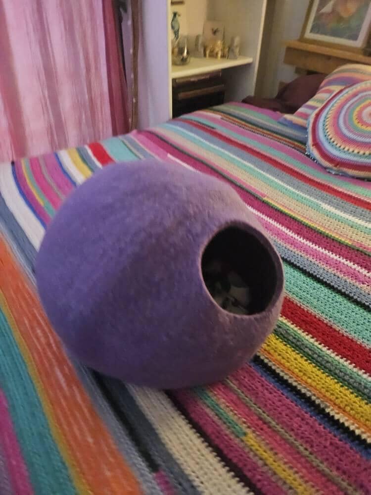 Confectionné artisanalement avec soin à partir de laine 100 % biologique selon la technique traditionnelle du feutrage à l'eau chaude savonneuse, ce panier est réalisé avec un extérieur en laine tyrolienne violette ou vert olive et un intérieur en laine tyrolienne couleur sable naturel . Sa construction épaisse et robuste lui permet de conserver sa forme tout en offrant une chaleur naturelle et le doux parfum de laine qui rappelle aux chats leur mère.